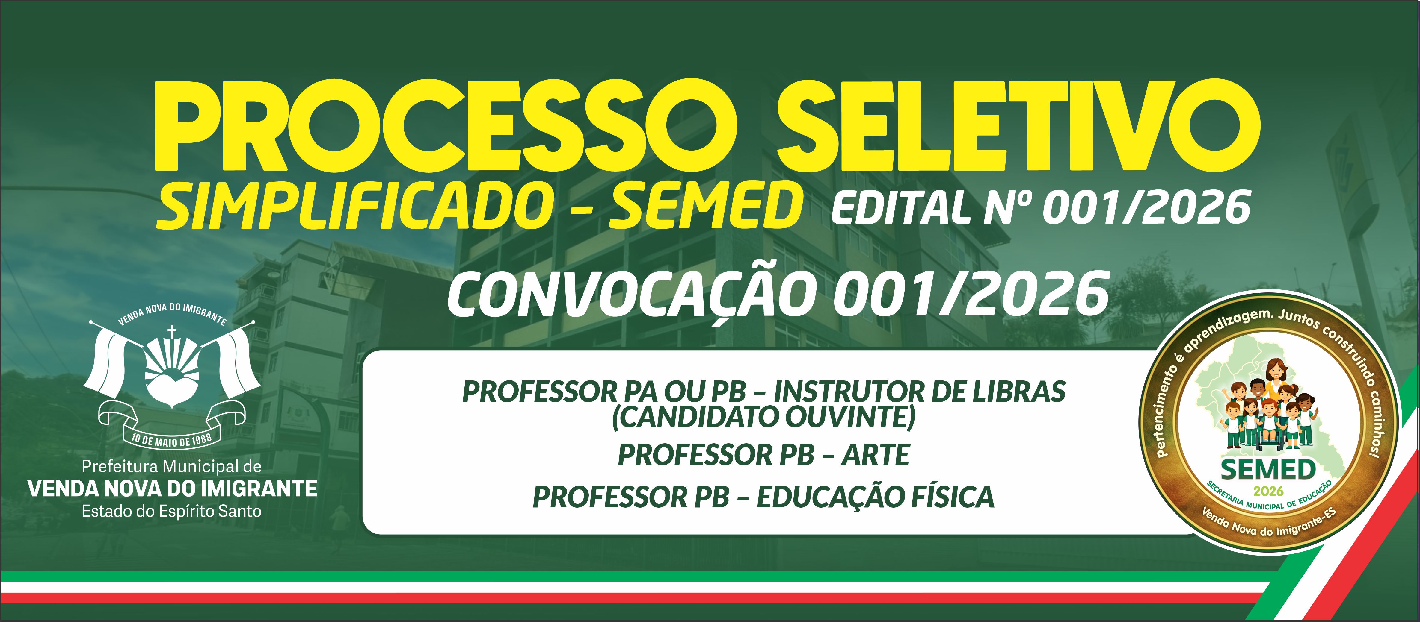 CONVOCAÇÃO SEMED N° 001/2026 - PROCESSO SELETIVO SEMED Nº 001/2026 - PROFESSOR PA OU PB INSTRUTOR DE LIBRAS (CANDIDATO OUVINTE) - PROFESSOR PB ARTE - PROFESSOR PB EDUCAÇÃO FÍSICA - 01/04/2026