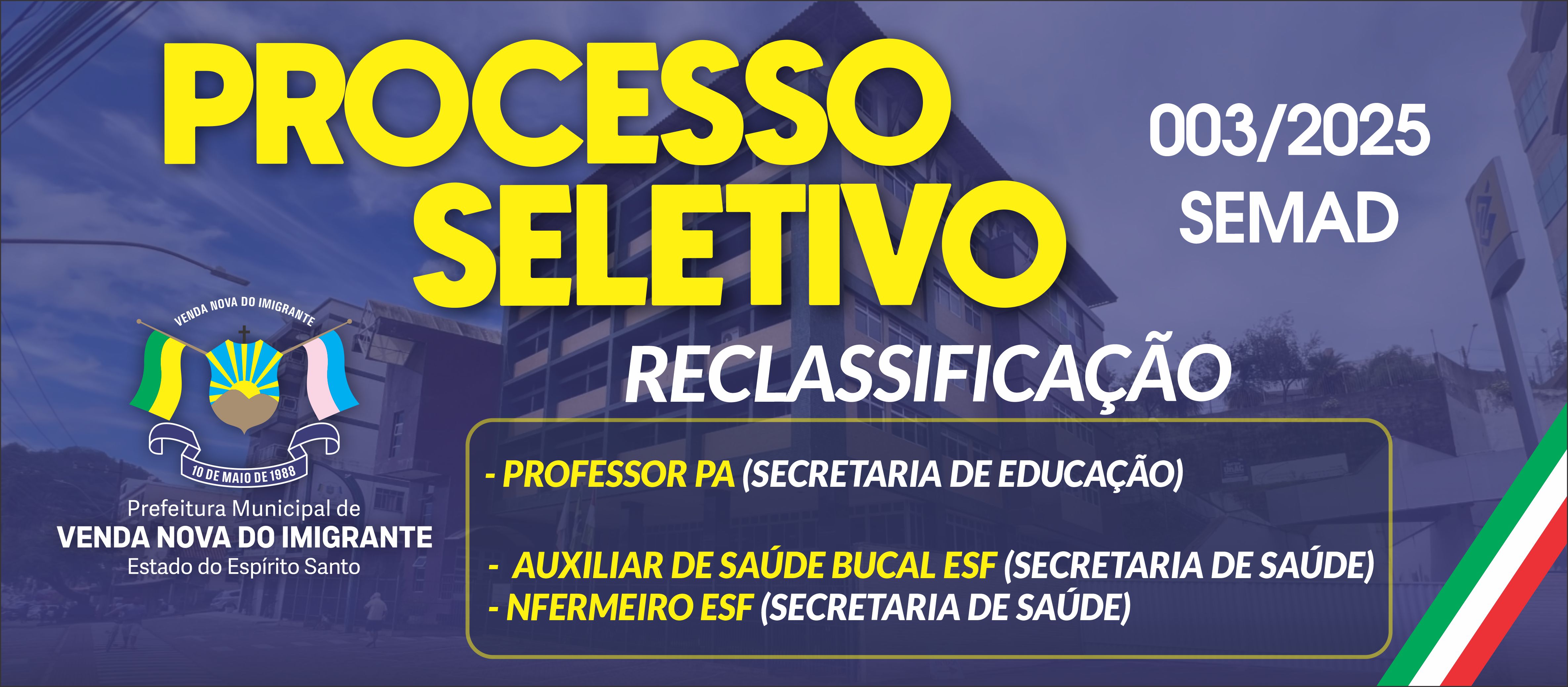 A PREFEITURA MUNICIPAL DE VENDA NOVA DO IMIGRANTE, por intermédio da Secretaria Municipal de Saúde, considerando o surgimento de vagas e a necessidade de suprir as demandas e garantir o bom funcionamento do serviço público, bem como o disposto no Edital de Processo Seletivo Simplificado nº 032/2025, cujo resultado foi devidamente publicado,