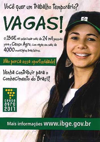 O Instituto Brasileiro de Geografia e Estatística (IBGE) está com inscrições abertas para o Censo Agro 2017. As vagas são para Agente Censitário Municipal (ACM) e Agente Censitário Supervisor (ACS). As inscrições vão até o dia 23 de maio e devem ser feitas pela internet.