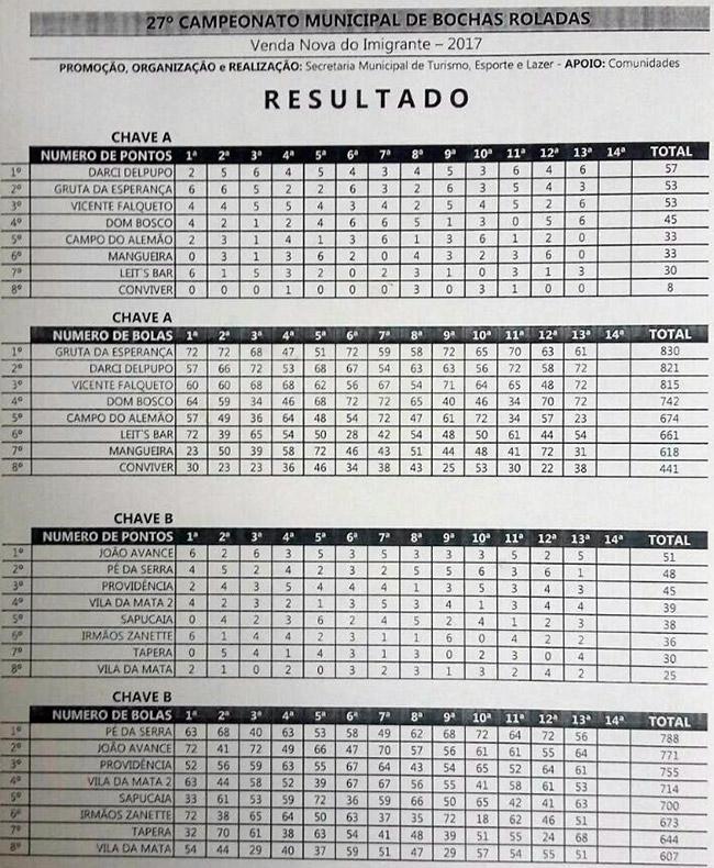 Confira abaixo os placares da última rodada e o resultado geral. Lembrando que o número de bolas é o critério de desempate.