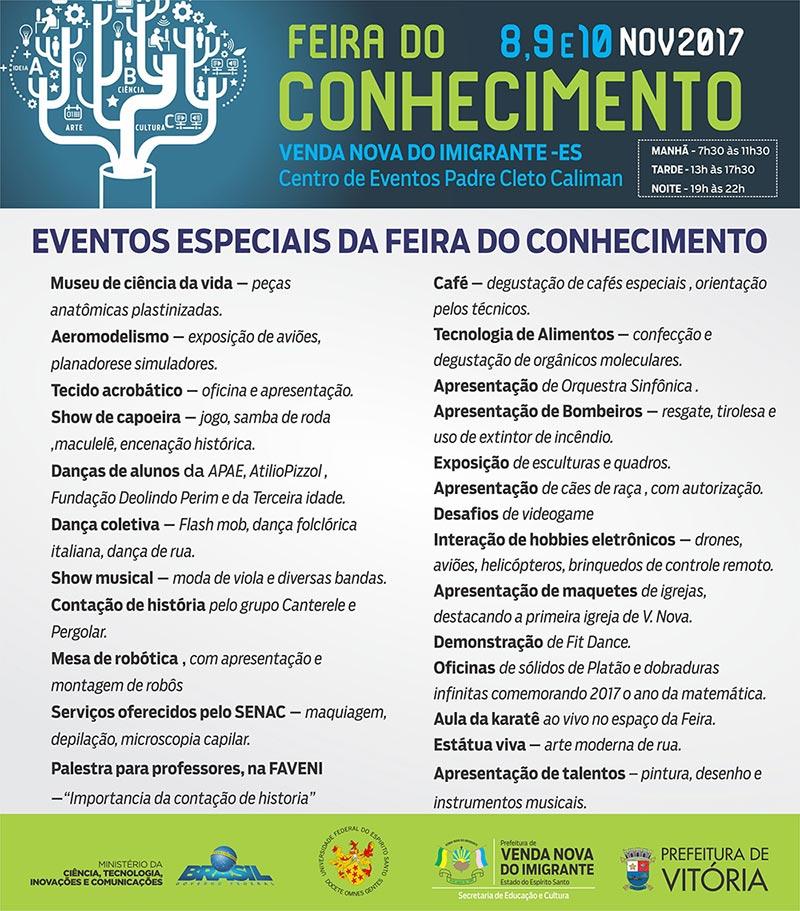 Está chegando a aguardada Feira do Conhecimento de Venda Nova do Imigrante. O evento, que vai de 08 a 10 de novembro, promete muito conteúdo interessante, curioso, informativo e até divertido para públicos de todas as idades. Serão três dias em que cultura, ciência e tecnologia estarão juntas em um só lugar.