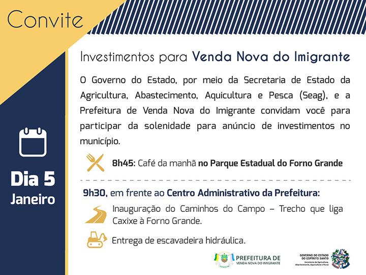 Às 8h45, acontece um café da manhã no Parque Estadual do Forno Grande. Logo depois, as autoridades seguem para o distrito de Alto Caxixe para a cerimônia de entrega e inauguração. Participe desse importante momento para a comunidade vendanovense! Veja o convite abaixo.