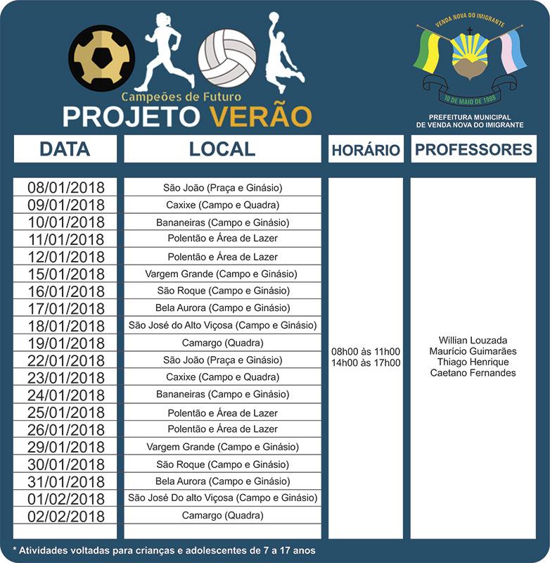 Quatro professores de educação física vão atender as comunidades vendanovenses conforme calendário abaixo. Para participar, basta comparecer ao local de realização do projeto, mas é preciso ter de 7 a 17 anos. Confira dias e locais e participe!