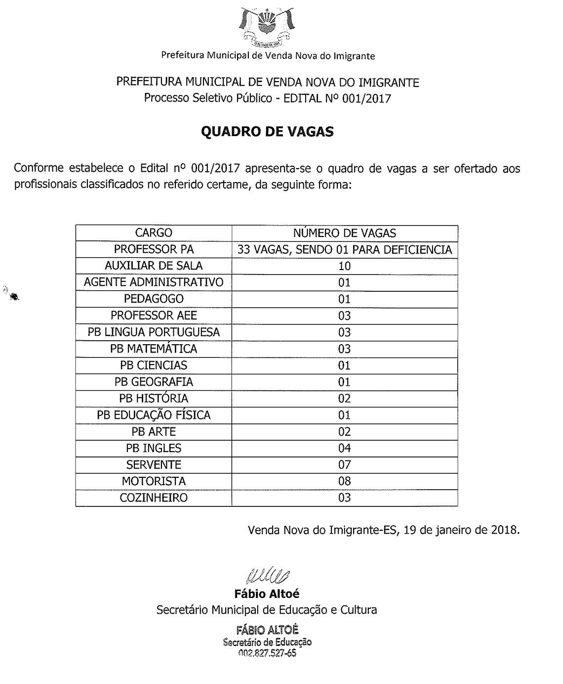 A Secretaria Municipal de Educação e Cultura (Semec) publica nesta sexta-feira o quadro de vagas ofertadas aos profissionais classificados no Processo Seletivo Público para DTs regido pelo edital 01/2017.