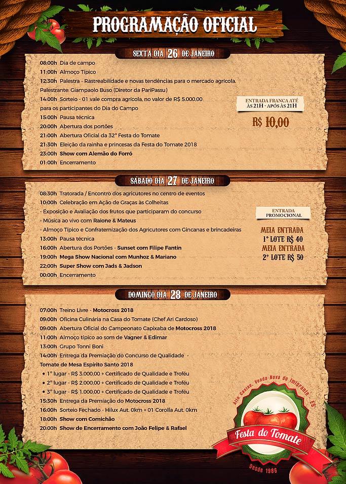 No último dia de evento, domingo (28), tem oficina de culinária com o chef Ari Cardoso, às 9h, etapa do Campeonato Capixaba de Motocross 2018, também às 9h; e sorteio de uma Hilux e um Corolla, ambos zero quilômetro. A festa termina às 20h, com show de João Felipe & Rafael. Confira abaixo a programação completa e participe!