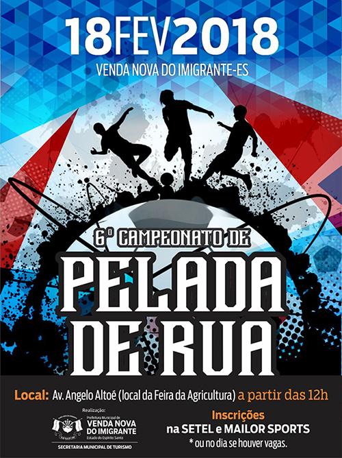 Atenção, peladeiros! Vem aí o Sexto Campeonato de Pelada de Rua de Venda Nova do Imigrante. Será no dia 18de fevereiro, a partir do meio-dia. Crianças e adultos de todas as idades poderão participar desse momento de diversão e confraternização. As inscrições são gratuitas e haverá premiação para os vencedores.