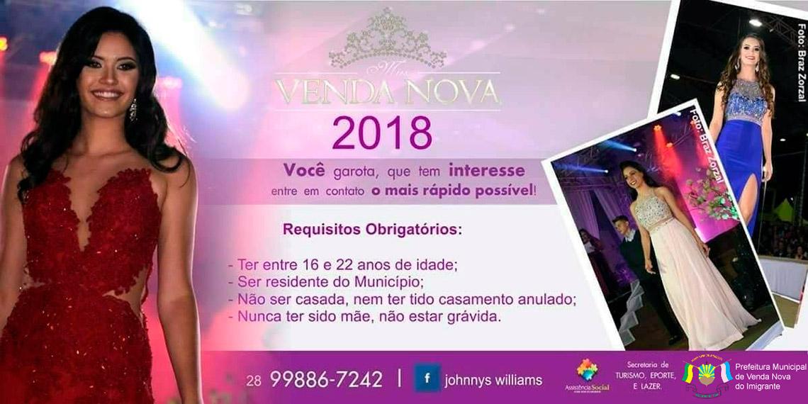 Estão abertas até o próximo dia 23 as inscrições para o concurso Miss Venda Nova 2018. Jovens de 16 a 22 anos já podem se preparar para mostrar sua beleza, simpatia e elegância a todos os vendanovenses. As interessadas devem entrar em contato com o organizador do desfile para se inscreverem.
