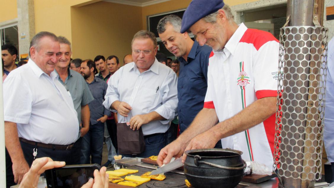 O ministro (centro) gostou de conhecer a polenta feita no Município - Ascom/PMVNI
