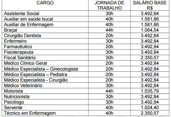 Todos os cargos são para cadastro de reserva e por designação temporária. Os aprovados convocados vão atuar nos anos de 2018 e 2019. Os salários vão de R$ 1.024,00, para servente, e chegam a R$ 3.492,00, para cargos como assistente social, médico especialista, dentre outros.