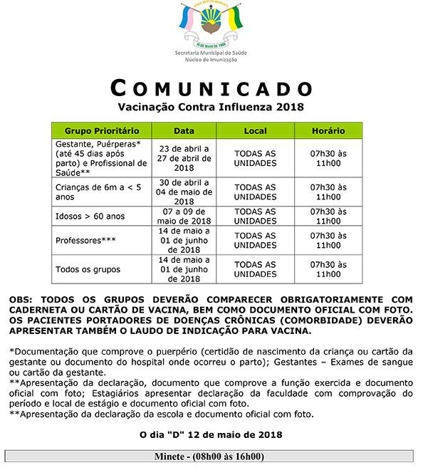 A vacinação começará pelas gestantes, mulheres que deram à luz há até 45 dias e profissionais da saúde. Todas as unidades de saúde do Município vão funcionar de 7h30 às 11h para realizar o trabalho. Já o Dia D vai acontecer em 12 de maio na Unidade de Saúde do Bairro Minete das 8h às 16h.