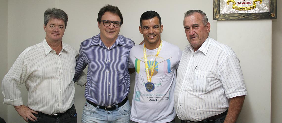 Jorge Uliana (esq.), secretário de esportes; Frederico Rodrigues, chefe de Gabinete e o prefeito Braz Delpupo parabenizaram o atleta - Ascom/PMVNI