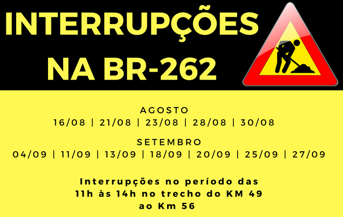 As obras de duplicação da BR-262 no Estado continuam. O Departamento Nacional De Infraestrutura de Transportes (Dnit) divulgou o cronograma de interdições no trecho que vai do Km 49 ao Km 56 da rodovia em agosto e setembro. O tráfego ficará totalmente interrompido durante a detonação de rochas.