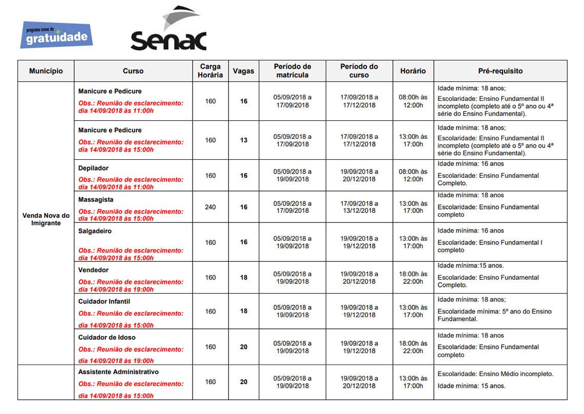 Na unidade de Venda Nova, o Senac oferece qualificações de manicure e pedicure, depilador, massagista, salgadeiro, vendedor, cuidador infantil, cuidador de idoso, e assistente administrativo. Os cursos vão acontecer em turnos diferentes, conforme você pode conferir na tabela abaixo.