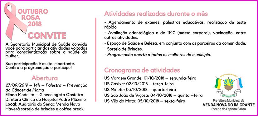 Estamos chegando ao Outubro Rosa e a conscientização sobre a saúde da mulher ganha ainda mais atenção. A Secretaria Municipal de Saúde (SMS) de Venda Nova do Imigrante preparou programação especial para elas e, principalmente, para abordar a saúde das mulheres de todas as idades.