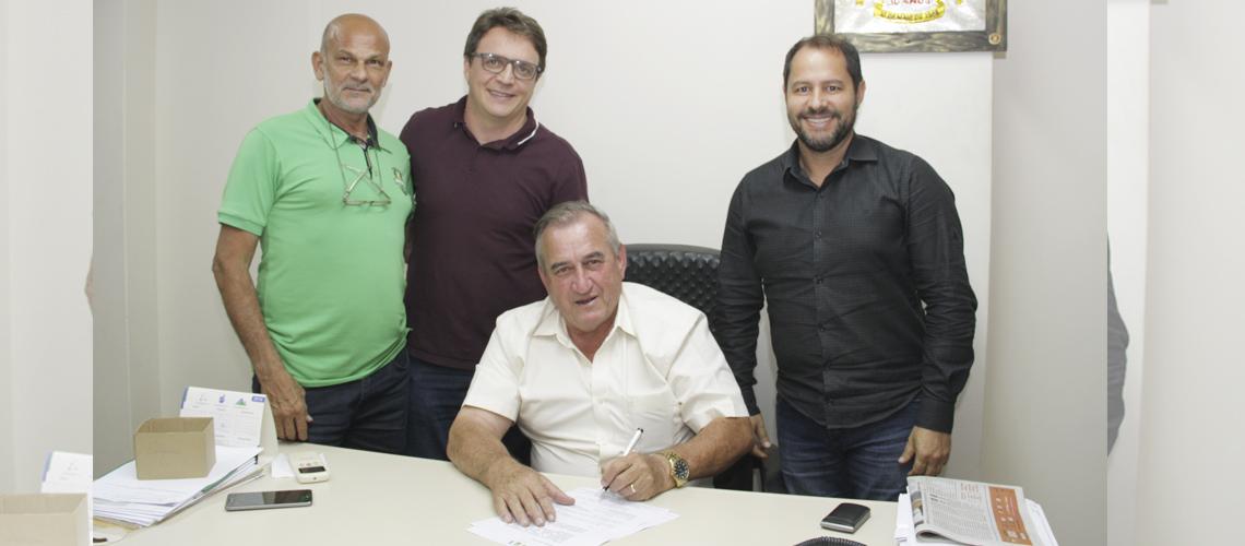 Presidente do Sindservenova, Osmar Xavier; Frederico Rodrigues, chefe de Gabinete, o prefeito Braz Delpupo e o secretário de Finanças, Rogério Dela Costa, na assinatura do projeto de lei