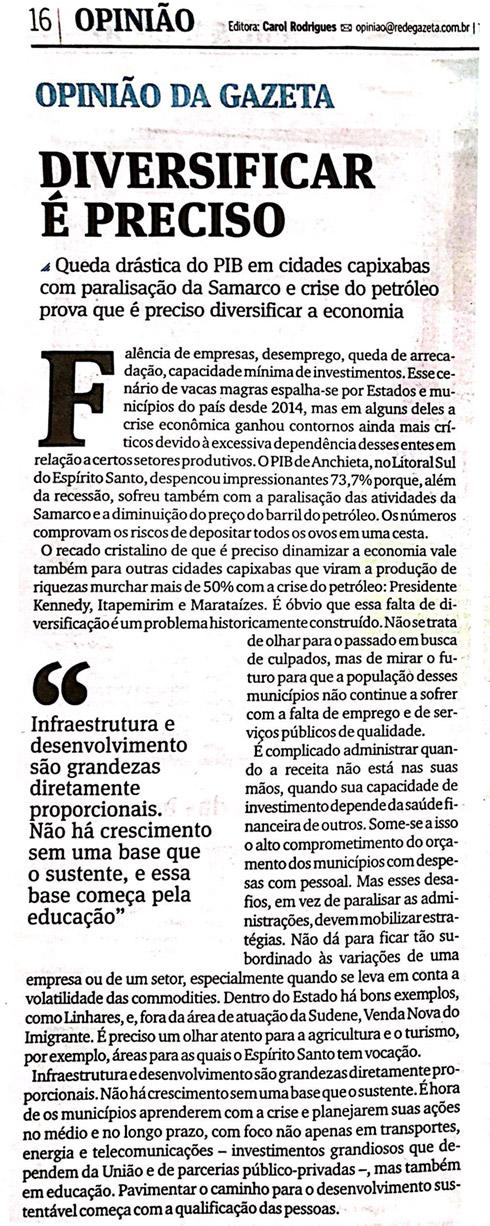 Nessa terça-feira (18) Venda Nova do Imigrante foi lembrada como bom exemplo de números positivos na economia. A citação apareceu em texto publicado no editorial do jornal A Gazeta que aborda a importância da diversificação econômica para evitar riscos de uma economia baseada em um único setor.
