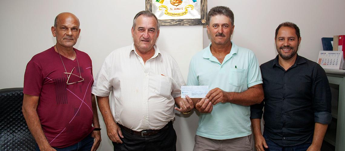 O vencedor segura o cheque do prêmio de R$10 mil reais ao lado do Prefeito Braz Delpupo e do secretário de finanças Rogério Dela Costa, com a presença de Osmar Xavier, presidente do sindicato dos servidores - Ascom/PMVNI