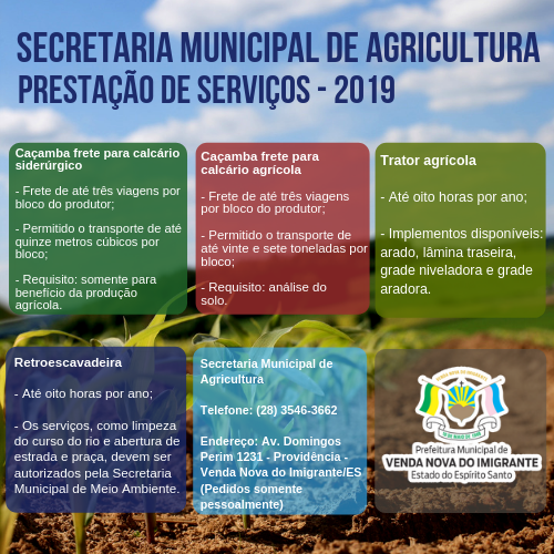 O produtor rural de Venda Nova do Imigrante vai contar com mais serviços gratuitos neste ano. A Secretaria Municipal de Agricultura voltará a atender normalmente às solicitações para retroescavadeira e trator. A novidade para 2019 é o transporte de calcário agrícola e calcário siderúrgico. Os pedidos podem ser feitos a partir desta sexta-feira (1°).
