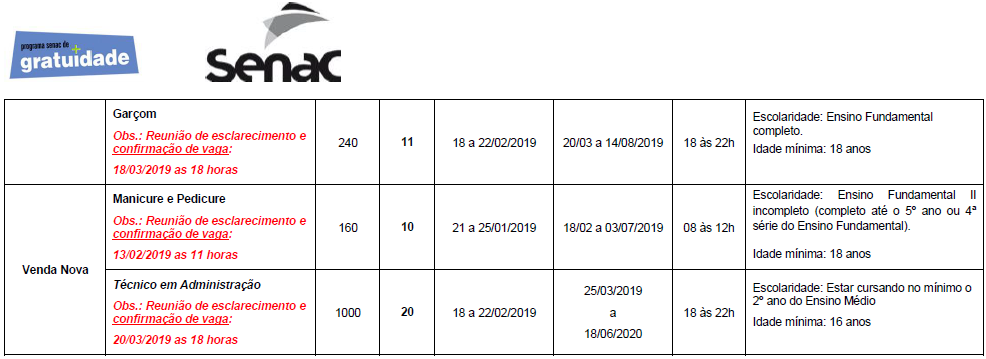 O Senac divulgou o edital para matrículas em cursos gratuitos. As formações atendem moradores com escolaridade e idades diversas, mas é preciso ter pelo menos 16 anos. As cargas horárias também são variadas. Para se cadastrar, procure o Senac de Venda Nova e leve a documentação exigida.