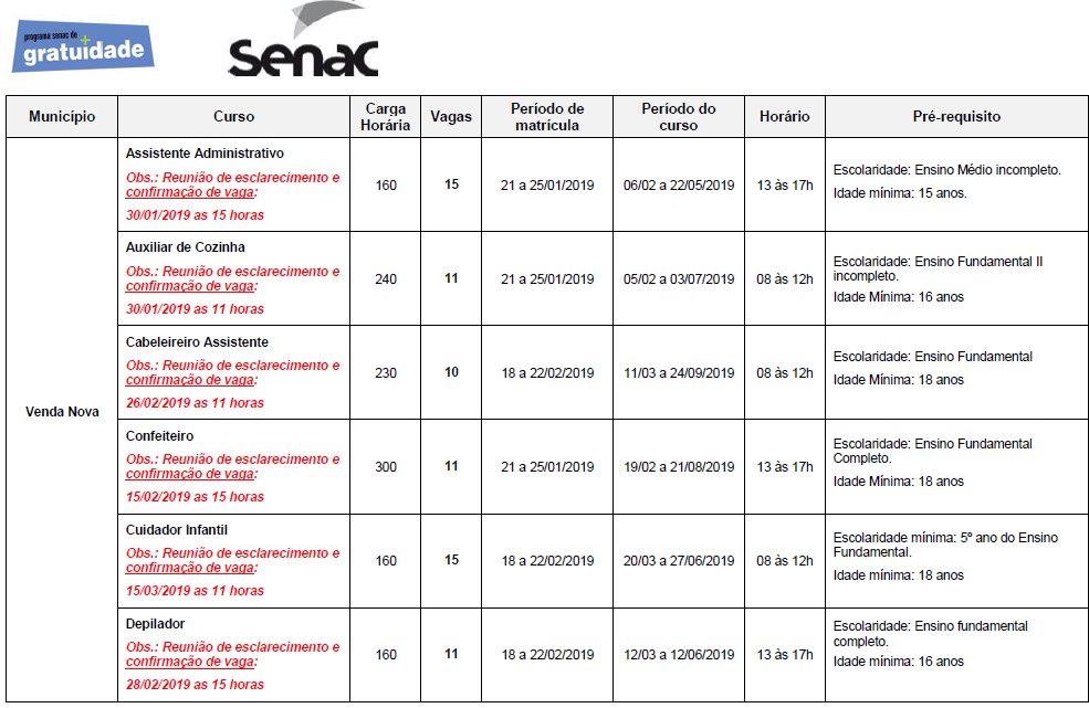 No primeiro trimestre de 2019, a unidade oferta cursos como cuidador infantil, cabeleireiro assistente, depilador, garçom, dentre outros. As opções fazem parte do Programa Senac de Gratuidade (PSG) que atendem quem tem renda familiar de até dois salários mínimos por pessoa.