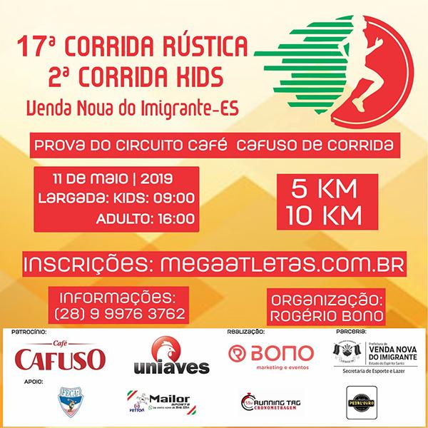 Os atletas vendanovenses e de outros municípios podem se preparar. Estão abertas as inscrições para a 17ª Corrida Rústica e Corrida Kids de Venda Nova do Imigrante. Adultos e crianças vão ter a chance de unir lazer e competição em percursos variados. As inscrições podem ser feitas pela internet ou em pontos físicos.