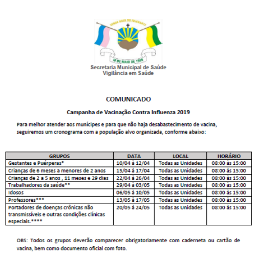 A Campanha da vacinação contra a gripe (Influenza) já tem programação para 2019. A Secretaria Municipal de Saúde vai imunizar os grupos de risco e conforme as datas do cronograma, que começa no próximo dia 10 de abril e será válido para todas as unidades de saúde de Venda Nova do Imigrante.