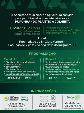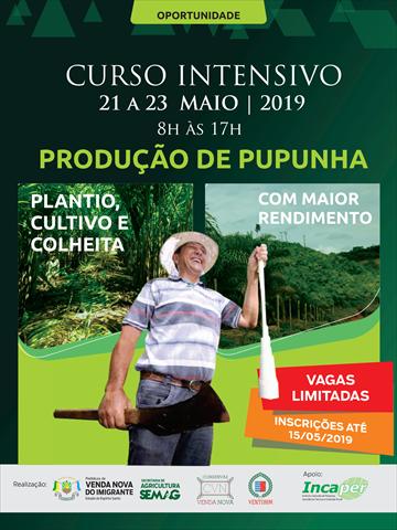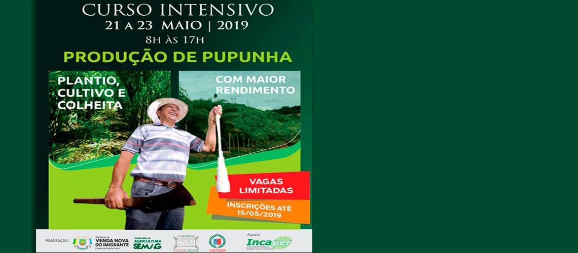 A Secretaria Municipal de Agricultura de Venda Nova do Imigrante divulgou programação gratuita para curso intensivo sobre a produção de pupunha. A capacitação, destinada aos produtores e técnicos sobre cultivo, plantio e colheita, vai acontecer de 21 a 23 de maio das 8h às 17h em São João de Viçosa. As inscrições ficarão disponíveis até o dia 15 de maio.