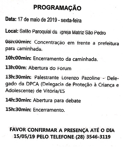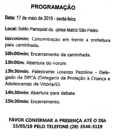 O fórum terá início às 13h e vai contar com a palestra de Lorenzo Pazoline, delegado da Delegacia de Proteção à Criança e Adolescente de Vitória. Porém, mais cedo, às 8h, haverá concentração para uma caminhada de conscientização. Os participantes vão se encontrar em frente à Prefeitura e depois percorrer as ruas de Venda Nova.