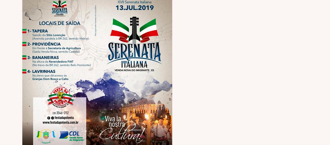 Que tal, no mesmo dia, descobrir cultura, história, tradição e friozinho vendanovenses? A Serenata Italiana, que festeja e aquece Venda Nova no mês de julho, já está a caminho. Este ano, a 17ª realização da Serenata Italiana vai acontecer no sábado (13), com previsão de saída dos bairros vendanovenses às 19h e chegada ao Centro de Eventos Padre Cleto Caliman às 22h. No mesmo dia, a Praça Padre Emílio vai sediar a 1ª Copa de Skate. Aproveite esses eventos para conhecer o nosso Município!