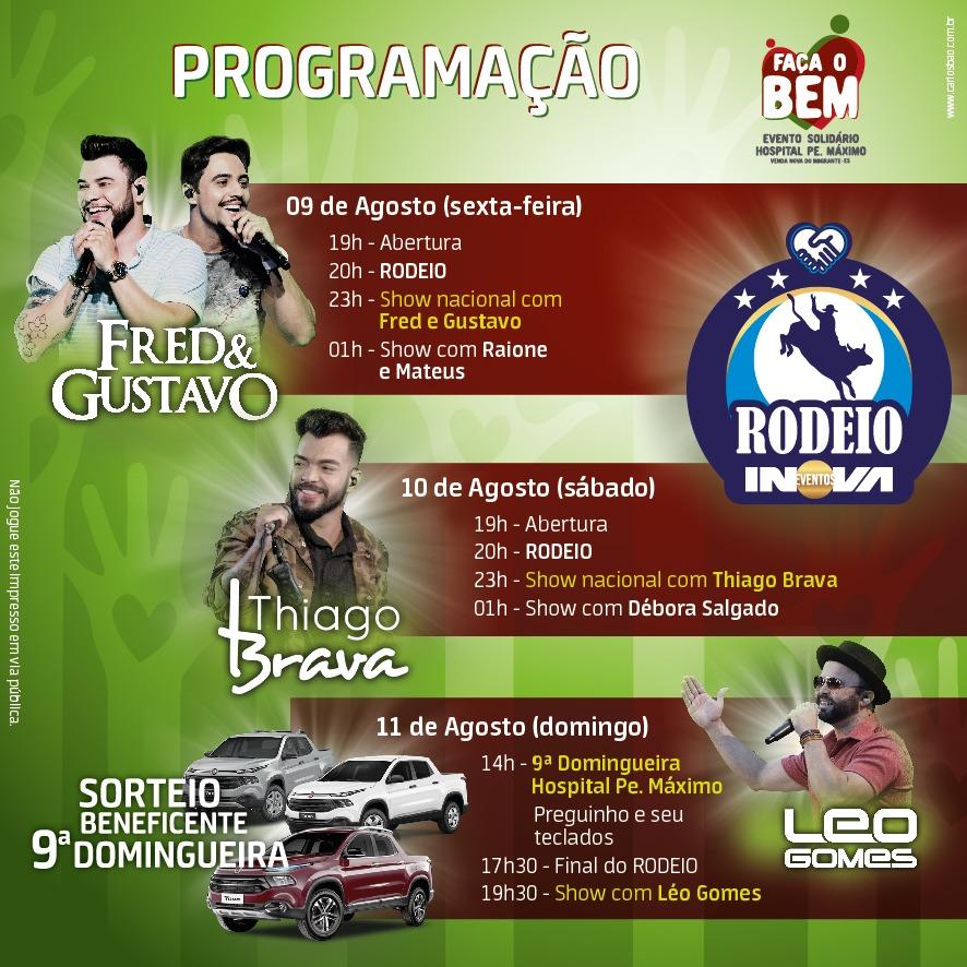 O Centro de Eventos Padre Cleto Caliman (Polentão) abre as portas na sexta-feira (09), às 19h. O rodeio profissional acontece logo em seguida, às 20h. Mais tarde, às 23h, a dupla Fred e Gustavo sobe ao palco. Os rapazes têm canções nas rádios e casas de show do Brasil inteiro e já gravaram com nomes como Gustavo Lima e Wesley Safadão. A noite termina com show de Raione e Mateus.