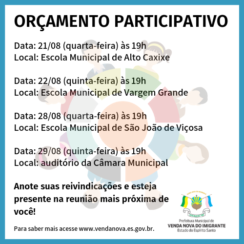 O Orçamento Participativo, que são reuniões com os vendanovenses para definir as prioridades no orçamento da Prefeitura de Venda Nova para o próximo ano, começa neste mês. O primeiro encontro será realizado na quarta-feira (21) na escola de Alto Caxixe. Participe e dê a sua sugestão sobre os serviços que precisam ser prestados pela Administração Municipal em 2020.