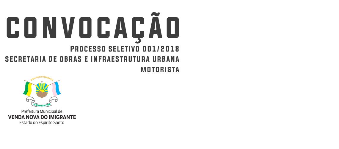 A Secretaria Municipal de Obras e Infraestrutura Urbana publicou nesta quinta-feira (12) edital de convocação de candidato aprovado no processo seletivo 001/2018. O prazo para comparecimento é de 48 horas.