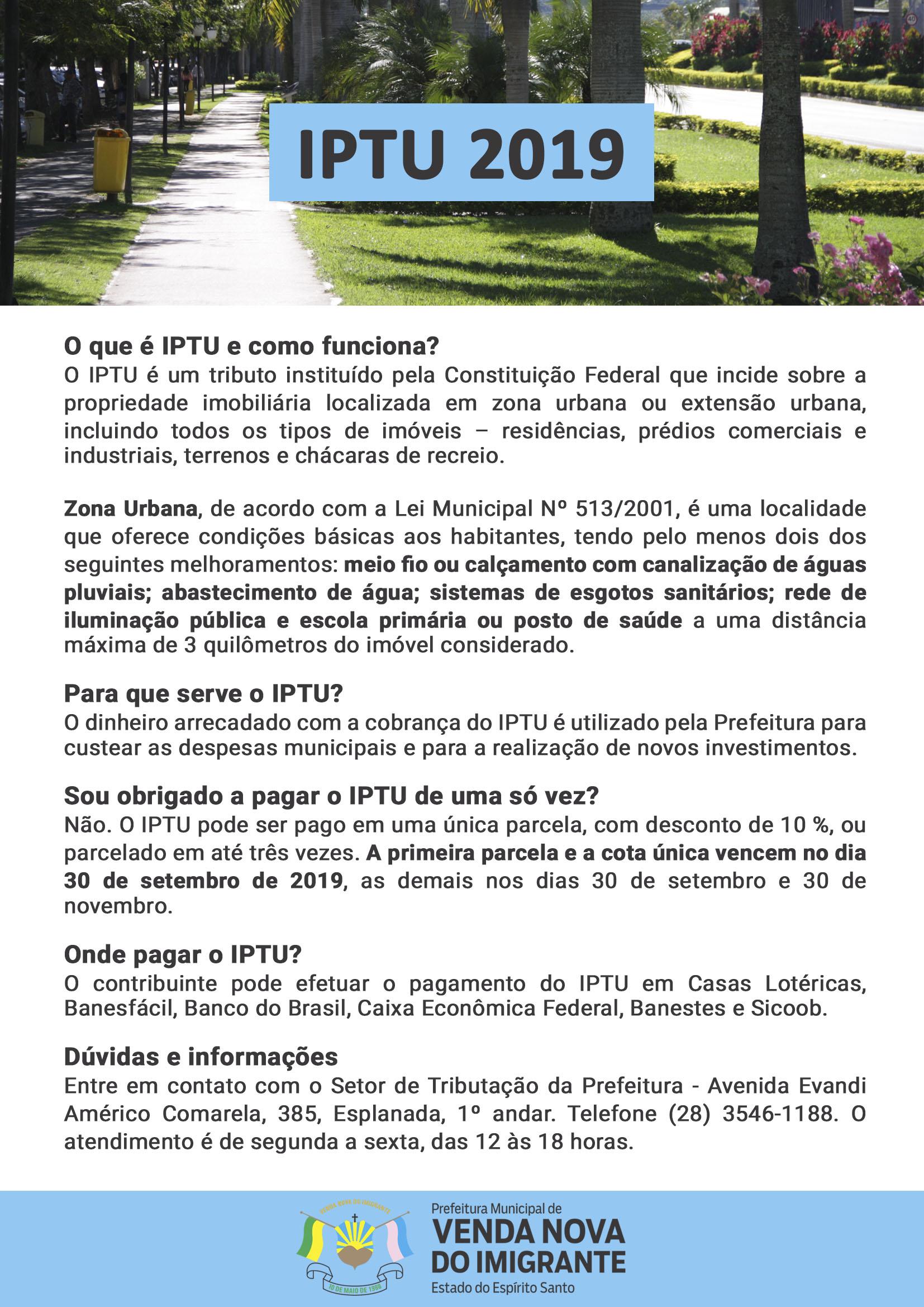 Os carnês do Imposto Predial Territorial Urbano, o IPTU, já foram distribuídos em Venda Nova e têm o primeiro vencimento para o dia 30 de setembro. O contribuinte poderá pagar o imposto em uma única parcela, recebendo um desconto de 10%, ou dividir o valor em até três parcelas – o valor de cada parcela não poderá ser inferior a R$ 53,40. A novidade é que neste ano o distrito de Alto Caxixe foi englobado à área de expansão do cadastro imobiliário recebendo a cobrança do imposto.