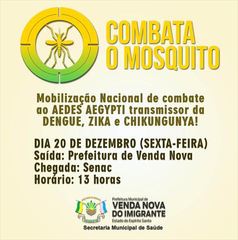 A Prefeitura Municipal de Venda Nova do Imigrante, por meio da Secretaria Municipal de Saúde, convoca à população em geral para participar, nesta sexta-feira (20), da mobilização nacional pelo combate ao mosquito Aedes aegypti, transmissor da dengue, zika e chikungunya - doenças que podem gerar enfermidades como microcefalia e guillain- barré.