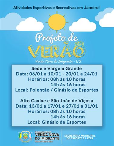 Voleibol, Futebol, Handebol, Futsal, Queimada, Pique Bandeira e Atletismo são algumas das atividades ofertadas. Na Sede (Polentão) e em Vargem Grande (Ginásio de Esportes) o projeto será de 06 a 10/01 e 20 a 24/01, das 08 às 10 e das 14 às 16 horas. Já em São João de Viçosa (Ginásio de Esportes) e no Alto Caxixe (Ginásio de Esportes) de 13 a 17/01 e 27 a 31/01, das 08 às 10 e das 14 às 16 horas.