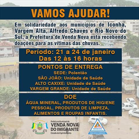 Segundo o prefeito Paulinho Mineti, a Prefeitura de Venda Nova disponibilizou um caminhão pipa para ajudar a cidade de Iconha e também veículos que colaboraram com o transporte de donativos recolhidos no fim de semana pela Afepol, Igreja Católica, entre outros. “Pedimos a colaboração de todos na doação de donativos em solidariedade aos municípios atingidos pelas chuvas”.