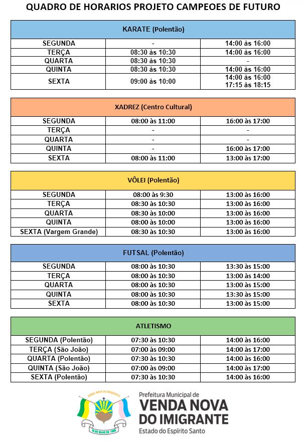 A Secretaria Municipal de Esporte e Lazer divulgou nesta quinta-feira (06) os horários e locais das atividades do Programa Campeões de Futuro. As aulas começam já na próxima segunda-feira (10) e mesmo quem não foi inscrito pode conhecer a iniciativa para decidir se deseja participar.