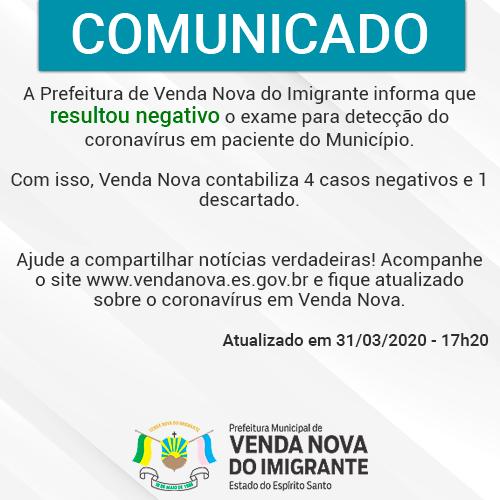 O quarto caso suspeito de coronavírus em Venda Nova do Imigrante testou negativo para o vírus. O resultado foi divulgado nesta terça-feira (31), por volta das 17h. Com esse resultado, o Município registra 4 casos negativos e 1 descartado.