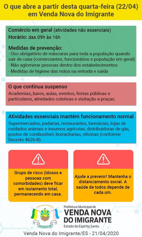 A Prefeitura de Venda Nova do Imigrante intensifica a partir desta quarta-feira (22) o trabalho de conscientização sobre os cuidados de prevenção do coronavírus. O objetivo é orientar a comunidade sobre como proceder após as novas normas de funcionamento de comércios e demais estabelecimentos.