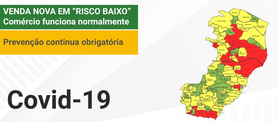 O Governo do Estado do Espírito Santo publicou nesse sábado (18) nova portaria que divulga a mais recente classificação de risco para Covid-19 nos municípios capixabas. Com a classificação, Venda Nova do Imigrante recebeu foi considerada como “risco baixo”, o que permite a reabertura de estabelecimentos comerciais em horários e dias normais. Medidas de prevenção, no entanto, continuam exigidas.