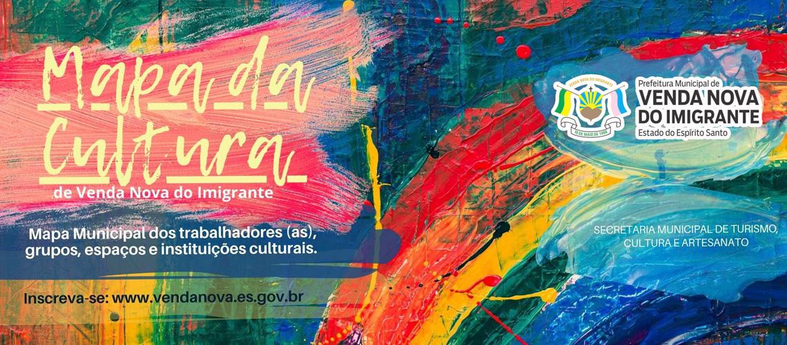 A Prefeitura de Venda Nova do Imigrante, por meio da Secretaria Municipal de Turismo, Cultura e Artesanato, lança nesta sexta-feira (24) o Mapa da Cultura, instrumento para cadastrar os trabalhadores e trabalhadoras da cultura, os espaços culturais, as entidades, festas tradicionais e os grupos ligados à cultura do Município. O formulário, acessível abaixo, objetiva auxiliar na implementação da Lei de Emergência Cultural Aldir Blanc e ficará disponível até o próximo dia 31 de julho.