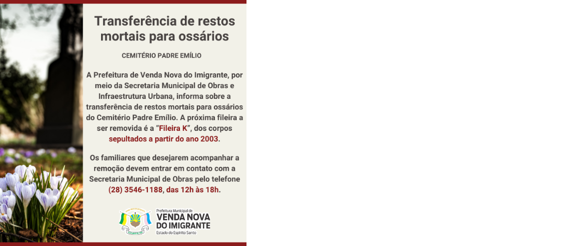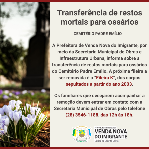 A Prefeitura de Venda Nova do Imigrante, por meio da Secretaria Municipal de Obras e Infraestrutura Urbana, informa sobre a transferência de restos mortais para ossários do Cemitério Padre Emílio. A próxima fileira a ser removida é a “Fileira K”, dos corpos sepultados a partir do ano 2003.
