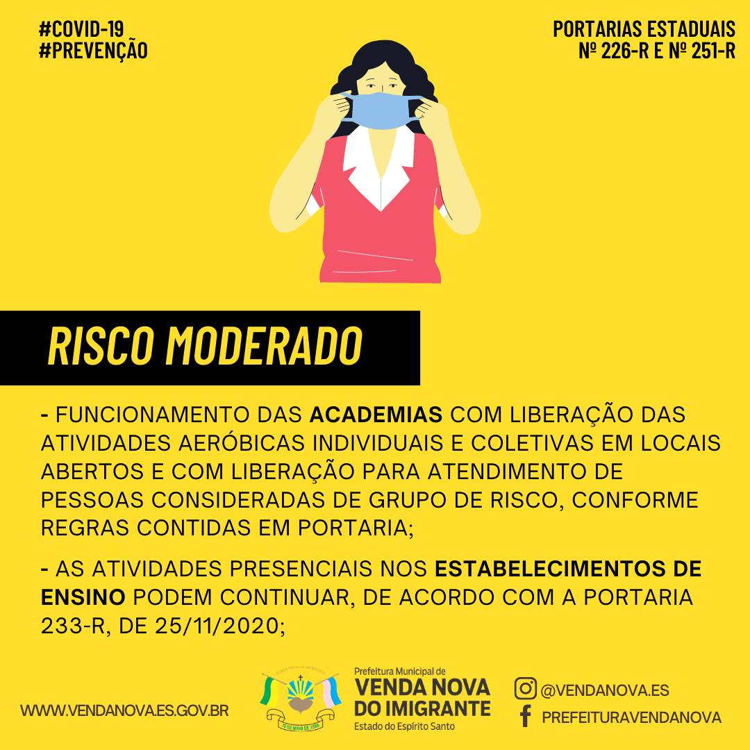 Veja abaixo as medidas qualificadas de enfrentamento à pandemia no Risco Moderado, de acordo com a legislação Estadual (Portarias N226-R e N 251-R)