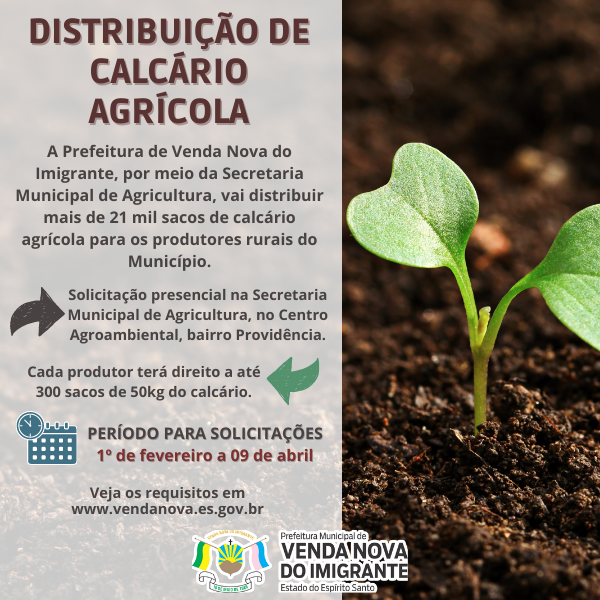 A Prefeitura de Venda Nova do Imigrante, por meio da Secretaria Municipal de Agricultura, vai distribuir mais de 21 mil sacos de calcário agrícola para os produtores rurais do Município. O insumo deve ser solicitado, presencialmente, a partir desta segunda-feira (1º) a 09 de abril, no Centro Agroambiental, na sede. Cada produtor terá direito a até 300 sacos de 50kg do calcário.