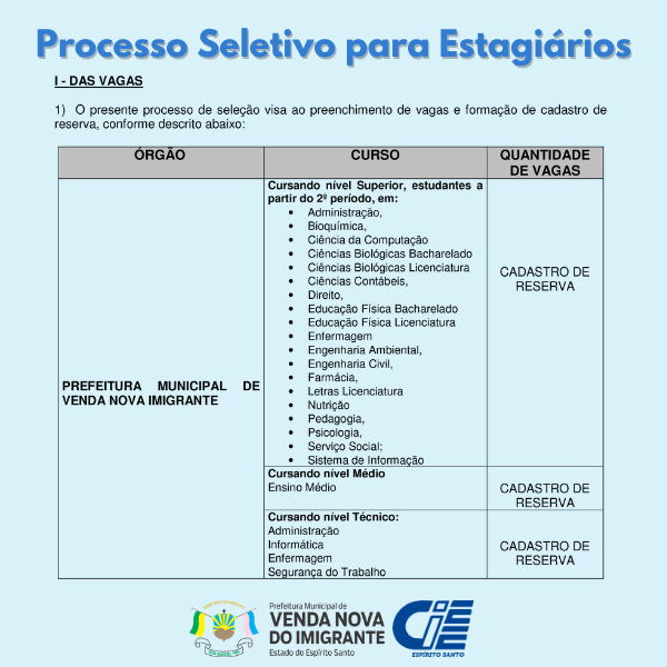 A Prefeitura de Venda Nova do Imigrante, em parceria com o Centro de Integração Empresa-Escola (CIEE/ES), divulga Processo Seletivo de Estagiários para cadastramento reserva de vagas em níveis médio, técnico e superior. As inscrições estarão abertas de segunda-feira (25) a domingo (31).