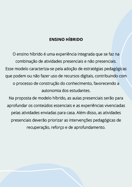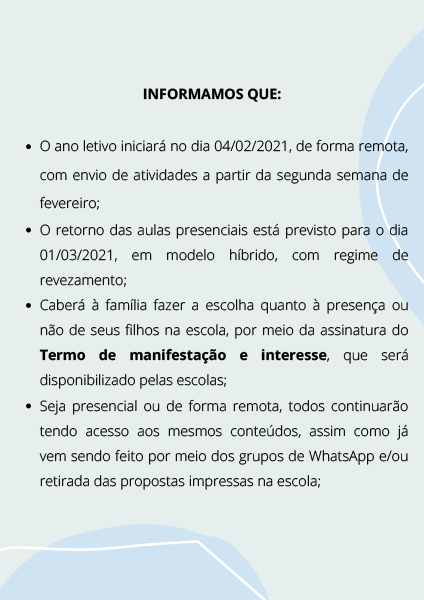 Em fevereiro, os alunos receberão propostas por meio de grupos do WhatsApp e/ou retirada impresso na instituição, quando não tiver acesso à internet. Já no mês de março, as aulas voltam a ser presenciais, com revezamento de grupos e dias da semana. A família do estudante escolherá quanto à presença ou não de seu filho na escola e os mesmos conteúdos serão garantidos aos alunos que optarem pelo formato remoto.