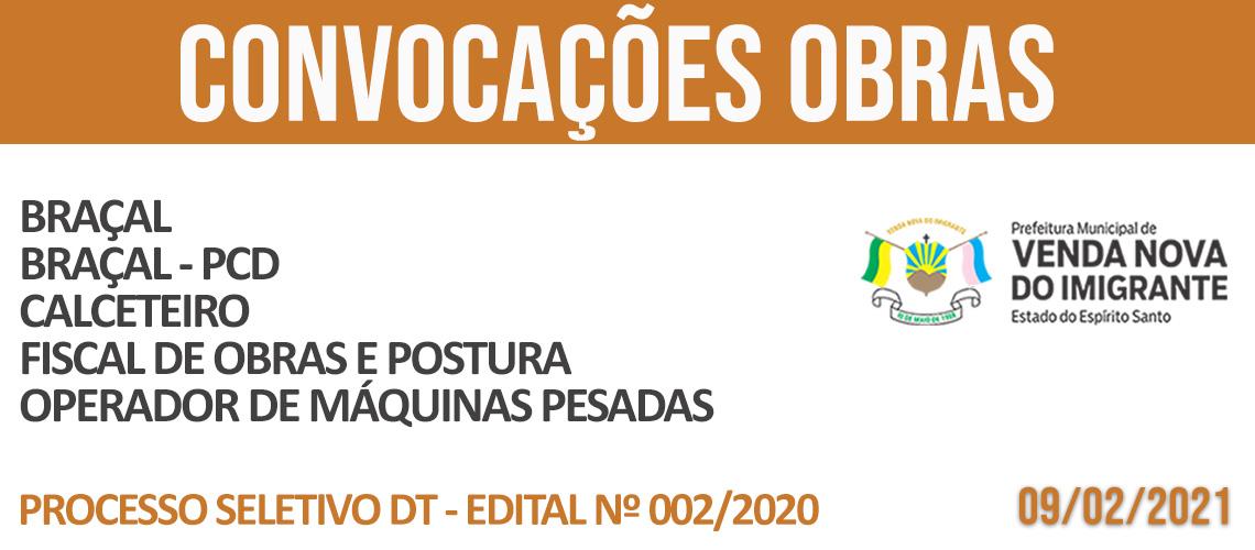 A Prefeitura de Venda Nova do Imigrante, por meio da Secretaria Municipal de Obras e Infraestrutura Urbana, convoca nesta terça-feira (09) aprovados no Processo Seletivo para DT, Edital N° 002/2020. Braçal, braçal PCD, calceteiro, fiscal de obras e postura e operador de máquinas pesadas são convocados.