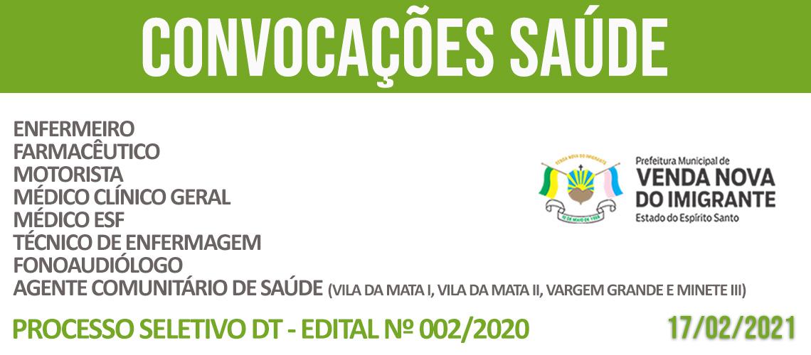 A Prefeitura de Venda Nova do Imigrante, por meio da Secretaria Municipal de Saúde (SMS), convoca nesta quarta-feira (17) aprovados no Processo Seletivo para DT, Edital N° 002/2020. As chamadas são para os cargos de Enfermeiro, Farmacêutico, Motorista, Médico Clínico Geral, Médico ESF, Técnico de Enfermagem, Fonoaudiólogo e Agentes Comunitários de Saúde dos bairros Vila da Mata I, Vila da Mata II, Vargem Grande e Minete III.