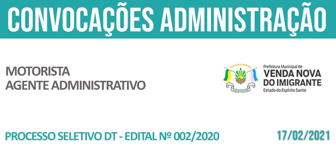 A Prefeitura de Venda Nova do Imigrante, por meio da Secretaria Municipal de Administração, convoca nesta quarta-feira (17) aprovados no Processo Seletivo para DT, Edital N° 002/2020. As chamadas são para os cargos de motorista e agente administrativo.