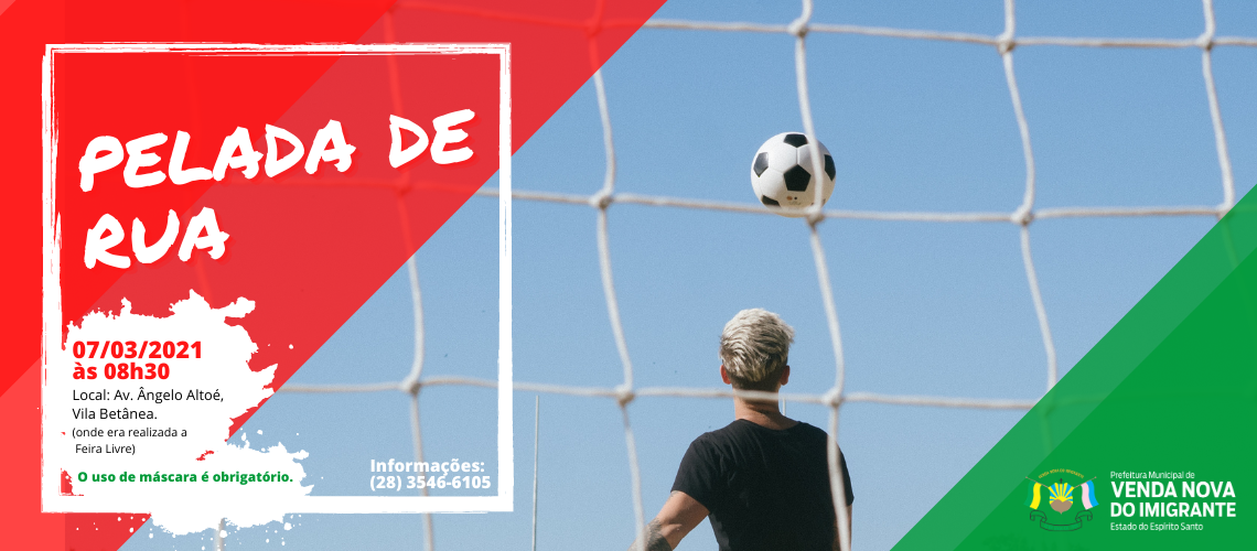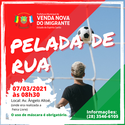 A Secretaria Municipal de Esporte e Lazer de Venda Nova do Imigrante promove no dia 07 de março mais uma edição do “Campeonato de Pelada de Rua”. Destinada ao público masculino e feminino a partir dos 10 anos, a competição se inicia às 8h30min, na Avenida Ângelo Altoé, local onde era realizada a Feira Livre no bairro Vila Betânea.